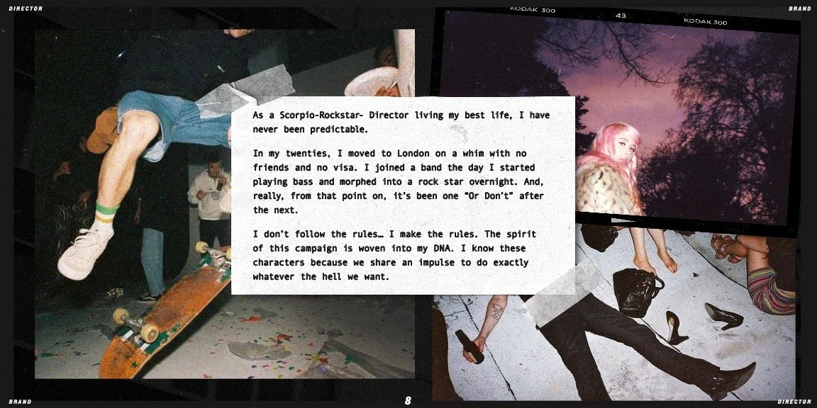 She’s known for bold aesthetics, emotive imagery, and a confident use of color. Her work is intuitive, and highly curated. She pulls references that don’t just look good, but lock into the emotion for the moment.